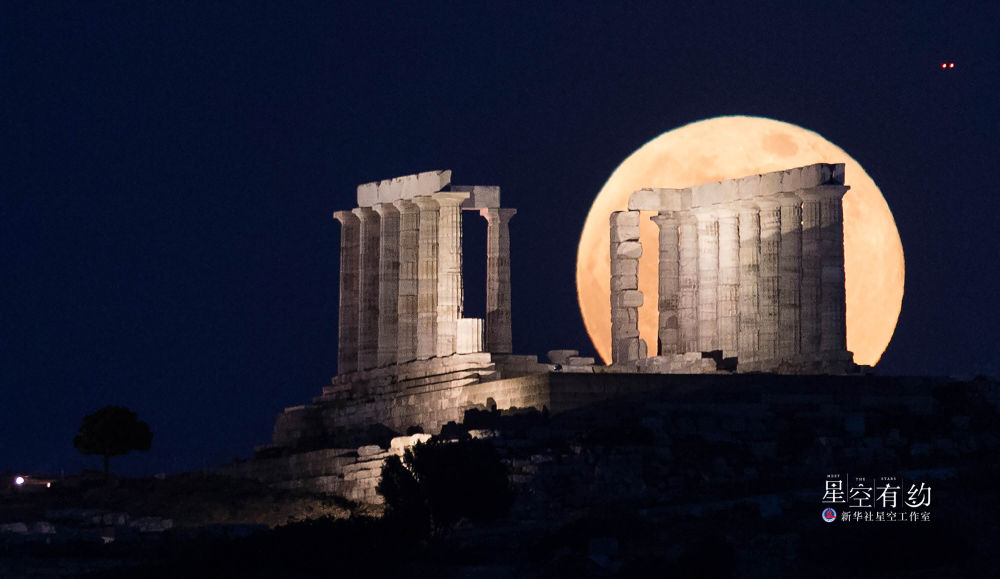 2021年5月26日,“超级月亮”出现在希腊苏尼翁的海神庙遗址上空。当晚,年度最大满月“叠加”年度唯一月全食所形成的“超级月全食”如约现身天宇。新华社发(马里奥斯·罗洛斯摄)